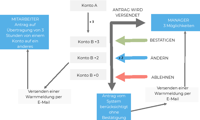 Über Mein Intranet kann der Mitarbeiter nun den Übertragungstyp auswählen und eine Konto-Übertragung ausführen. Hat er seinen Antrag erstellt, erscheint ein Bestätigungsfenster. Berücksichtigt der Antrag die zuvor eingestellten Bedingungen nicht, kann eine Warnmeldung angesagt sein. Der Vorgesetzte dieses Mitarbeiters wird per E-Mail über diesen Antrag informiert und kann ihn bestätigen, ändern oder ablehnen.