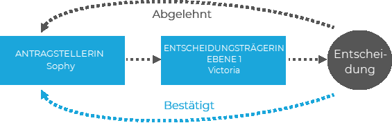 1.Sie ist abwesend und die Weiterleitung ist aktiviert. Die Datei wird dem stellvertretenden Entscheidungsträger Johann Bräuer übermittelt, der den Antrag entweder genehmigt oder ablehnt. Die Datei wird dann dem Entscheidungsträger höherer Ebene übermittelt (hier nicht vorhanden).