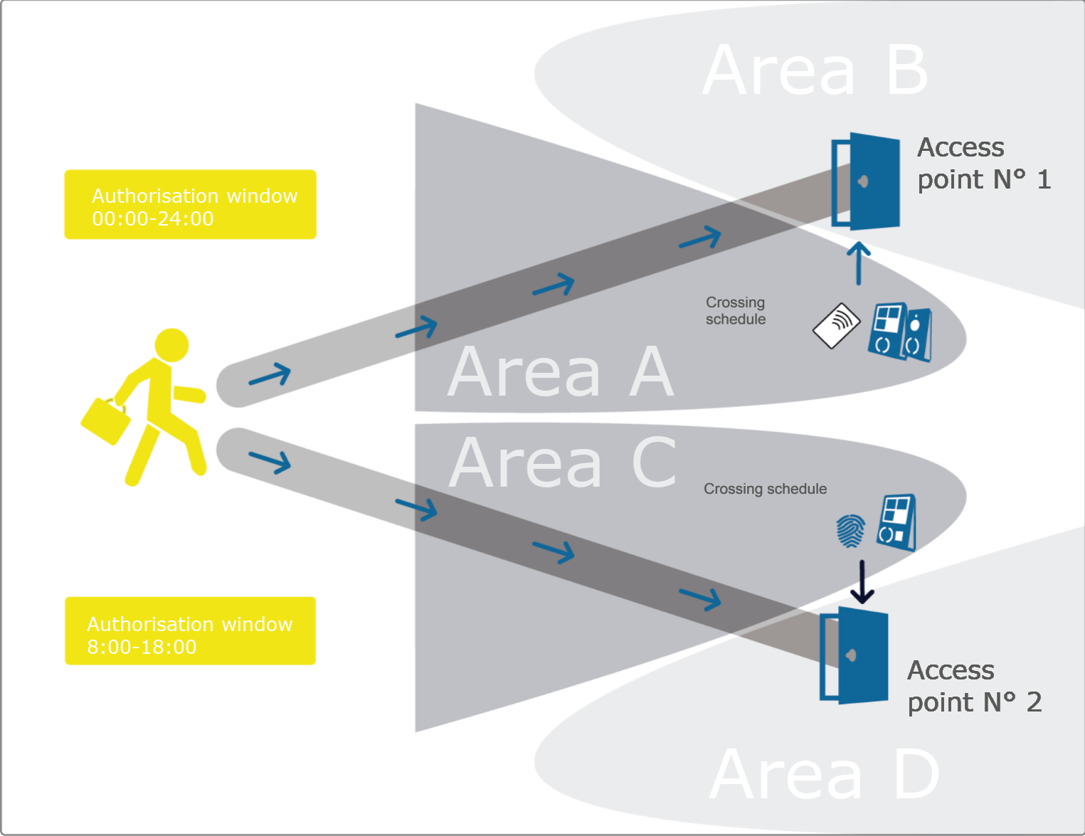 •an employee is associated to an access profile which determines when he/she is authorised to access each selected access point,
