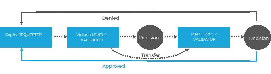 1.If she is absent and the transfer is activated, the file is submitted to the transfer validator, Marc, who will accept or refuse the request. Then the file will be submitted to his higher level validator (here, there is none).