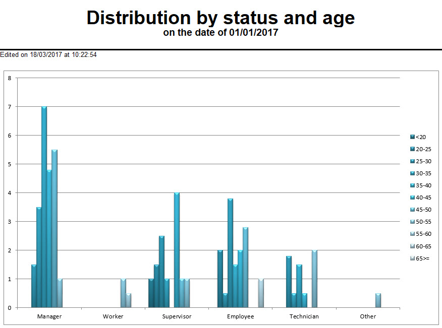•Si el empleado no tiene estatuto de categoría a la fecha de extracción entonces no es contabilizado. •Si el empleado no tiene uno de los estatutos de categoría seleccionados a la fecha de extracción entonces no es contabilizado. •Si el empleado no tiene fecha de nacimiento entonces no es contabilizado. •Si la toma en cuenta del equivalente tiempo completo está marcada, entonces: o- el empleado cuenta como 1 X la tasa del contrato, si no cuenta como 1. o- nº empleados = suma de las tasas / 100, si no nº empleados= nº empleados tratados. |