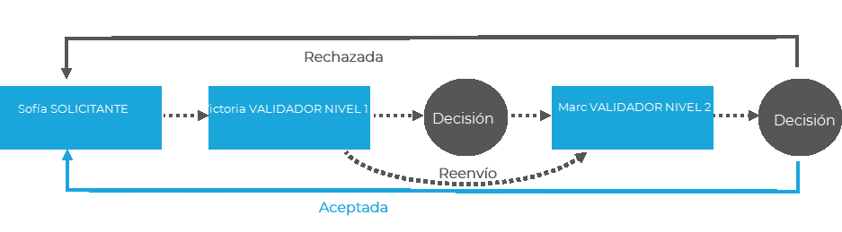 Victoria no tiene validador de nivel superior ni validador de reenvío. La ficha puede ser validada o rechazada. Si es validada, se crea una ficha de ausencia en el sistema de gestión de tiempos. En todos los casos, la ficha es reenviada al solicitante con el fin de informarle de la decisión.