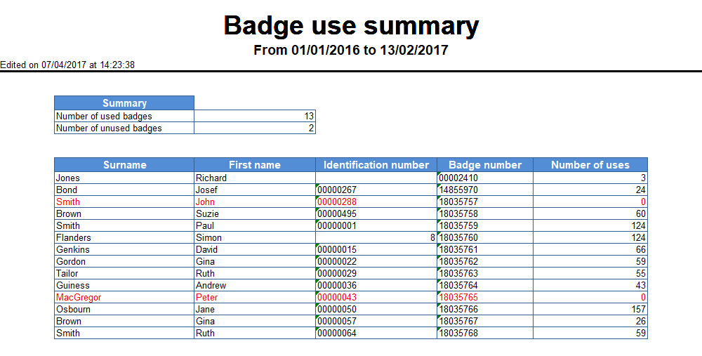 •Table 1: Employee last name, Employee first name, ID number, Badge number, Number of times the badge was used