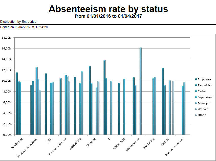 For each level of the organisation chart selected, the system adds employees' various totals in days for the departments at the level to be processed, grouping them by status (only for the selected statuses).