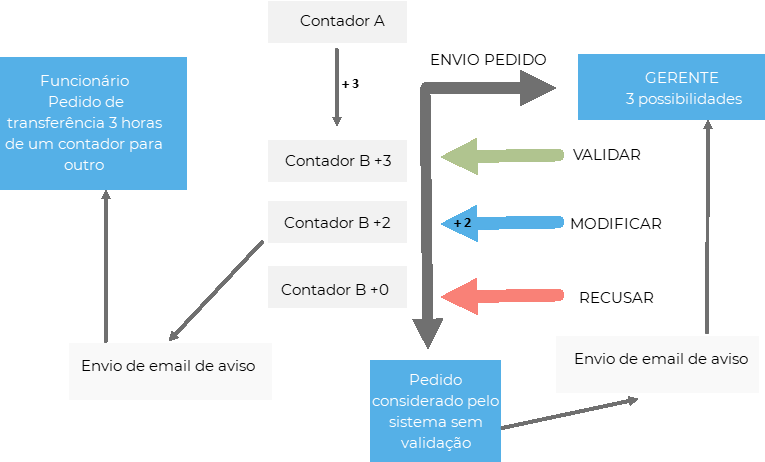 Um funcionário solicita a transferência de 3 horas do seu contador de horas extras para seu contador de recuperação. O administrador pode então: