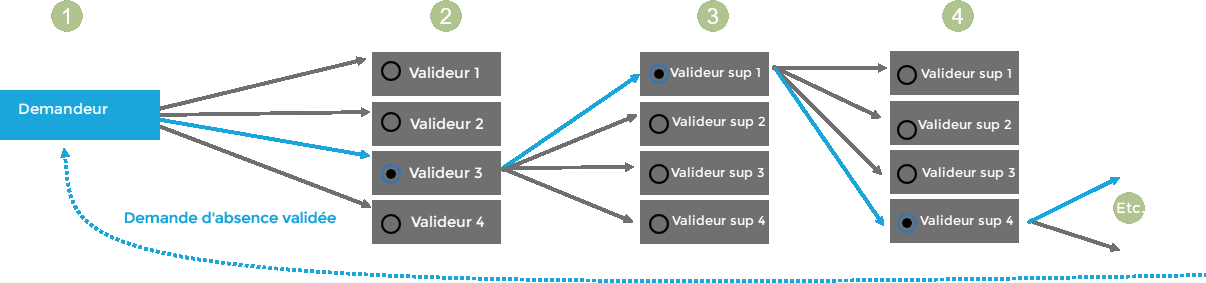 La notion de valideur parallèle s'applique aussi sur les valideurs supérieurs ; chaque valideur peut avoir un ou plusieurs valideurs supérieurs. L'ensemble des valideurs supérieurs reçoivent les demandes d'absence et les alertes. Le 1er valideur supérieur qui agit sur la demande d'absence s'attribue le suivi. Les autres valideurs supérieurs ne peuvent alors plus agir sur cette demande d'absence. Ils peuvent la suivre et conserver la réception des alertes pour être informés.