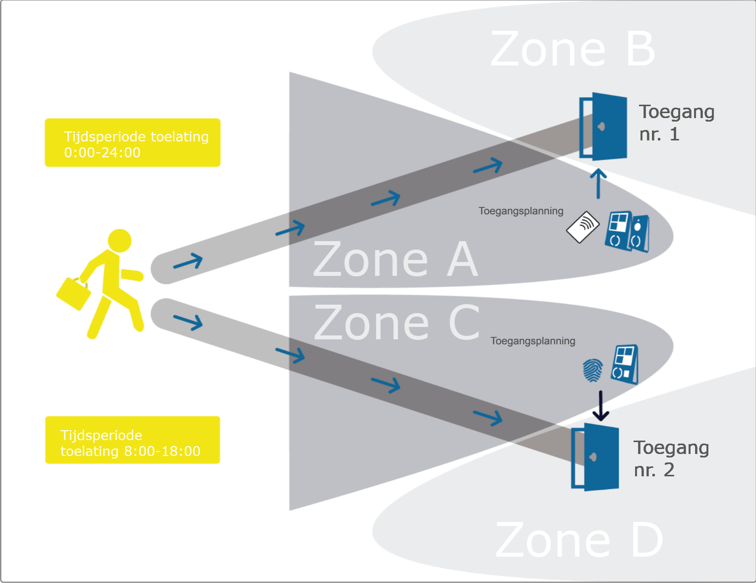 een toegang is verbonden met een doorgangsschema dat de veiligheidsniveaus voor de verschillende periodes bepaalt (dag, week, maand).