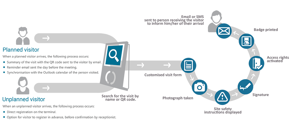 •Het veiligheidsniveau in uw ruimtes verbeteren door de bezoekers te integreren in het monitoren van toegangen en aanwezigheidslijsten.